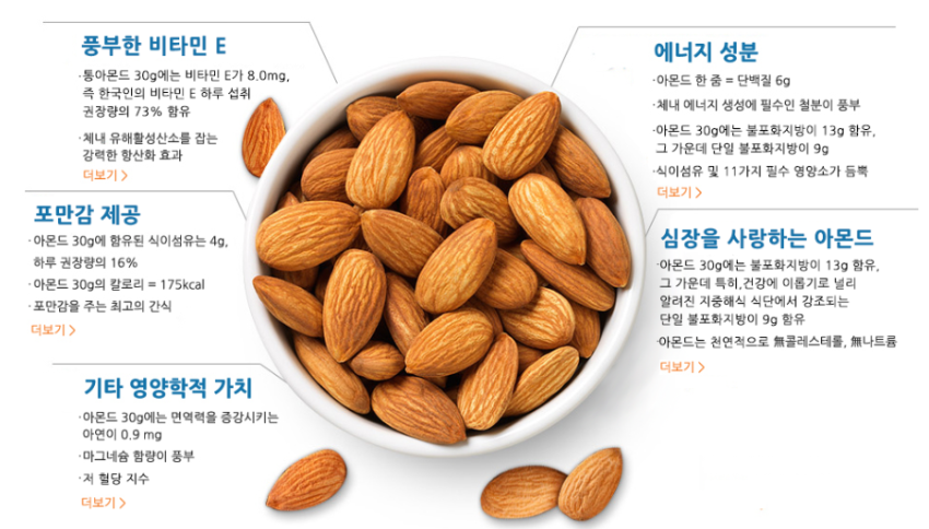 아몬드는 노화를 방지해주며, 몸의 활성산소를 막아주는 항산화물질이 풍부한 식품입니다. 노화를 방지해주고 비타민E가 풍부하여 콜레스테롤을 낮추는데 효과가 있으며, 불포화지방산이 성인병을 예방해주고 각종 미네랄이 들어있어 뼈를 보호하여 골다공증 예방에 좋을 뿐 아니라 두뇌 발달에도 좋습니다.