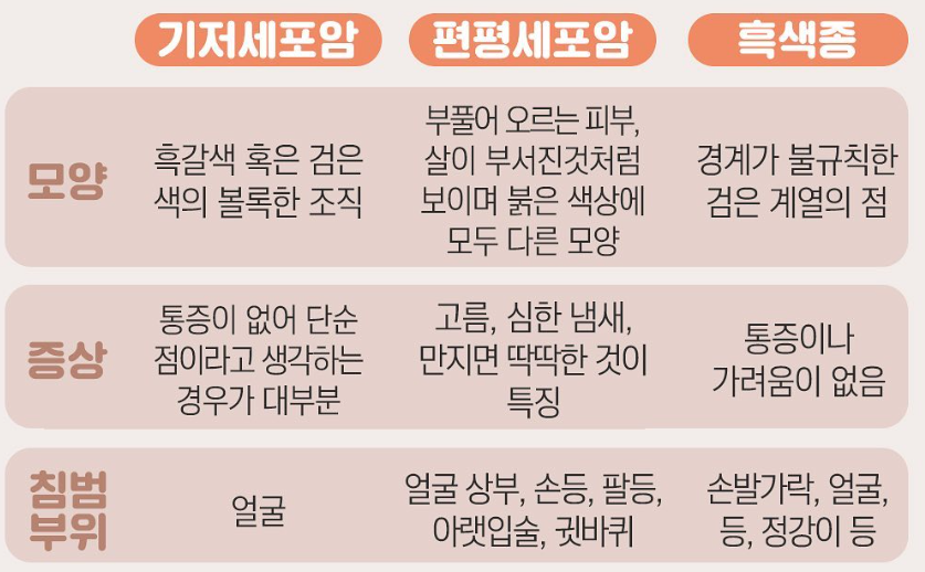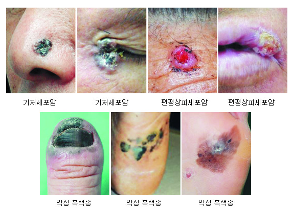 편평 세포암이라 불리는 피부암도 역시 자외선과 관련이 있으며, 주로 백인들과 같은 하얀 피부와 금발, 소아기의 주근깨 등이 위험인자로 알려져 있습니다.