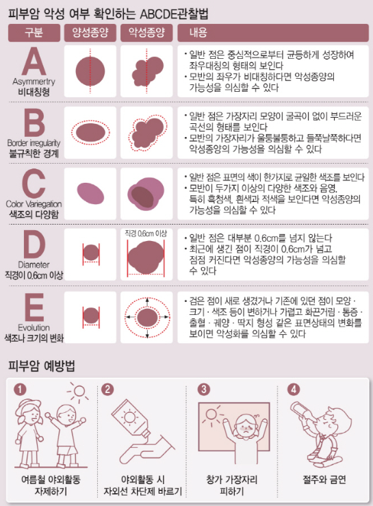 즉, 피부병은 자외선이 가장 큰 원인으로 특히 자외선 B를 철저히 차단하는 것이 중요하며, 피부색이 하얀 백인이나 피부암 등의 가족력이 있는 사람은 특히 조심해야 하며, 검은 점이 새로 생긴다던지, 기존에 있던 점의 크기가 변하다던지 통증 등이 생기는 경우에는 피부과 의사의 진료를 받아야 합니다.