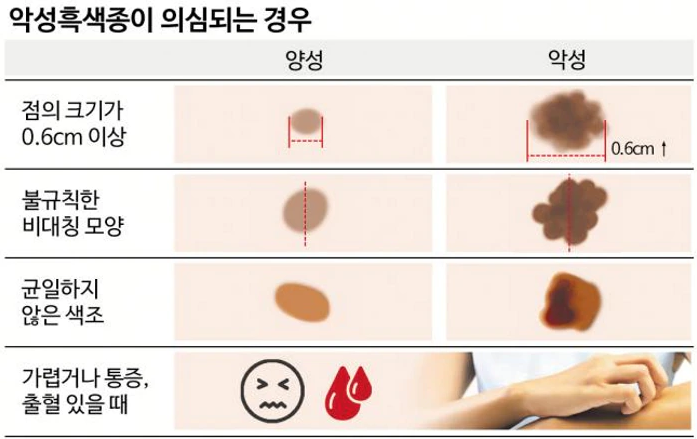 흑색종이라고 불리는 피부암도 유전적인 요소와 자외선 노출에 매우 연관이 되어 있으며, 30~40%의 경우는 기존의 점에서 발달하여 피부암으로 발전한다고 합니다.