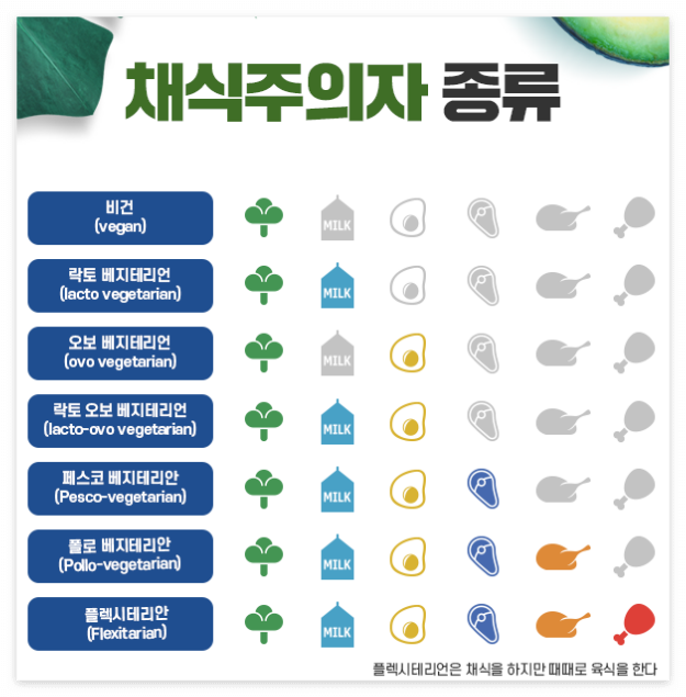 - 락토오보 베지테리언 : 채소, 우유 등 유제품, 달걀